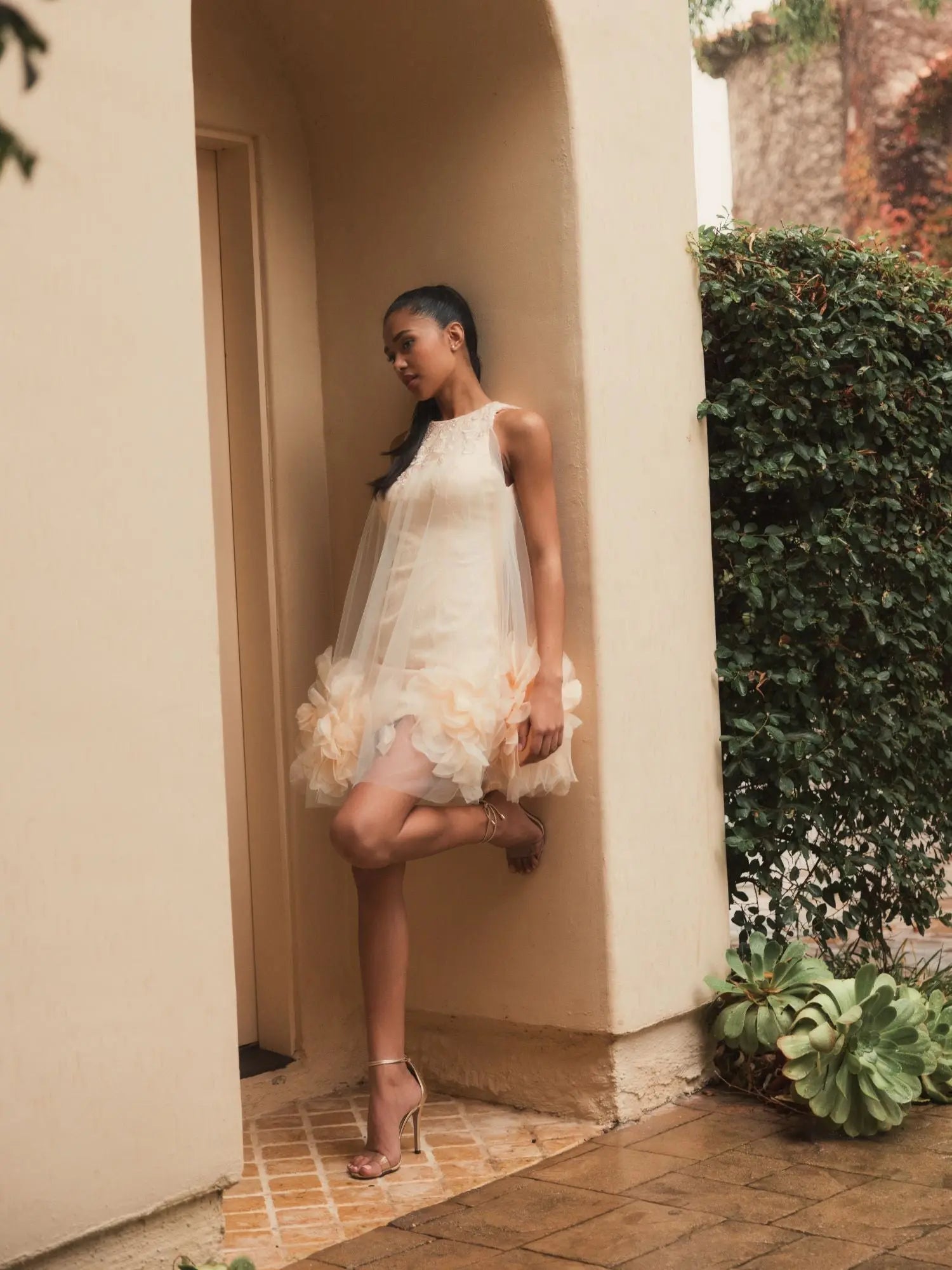 This playful design starts with a mini sheath featuring cutaway shoulders and neckline embroidery. A trapeze-cut layer of tulle adorned with oversized floral poufs tops the leggy underlay for a look that’s modern, youthful, and oh-so-chic. Highlight the flirty hem with lengthening stilettos.