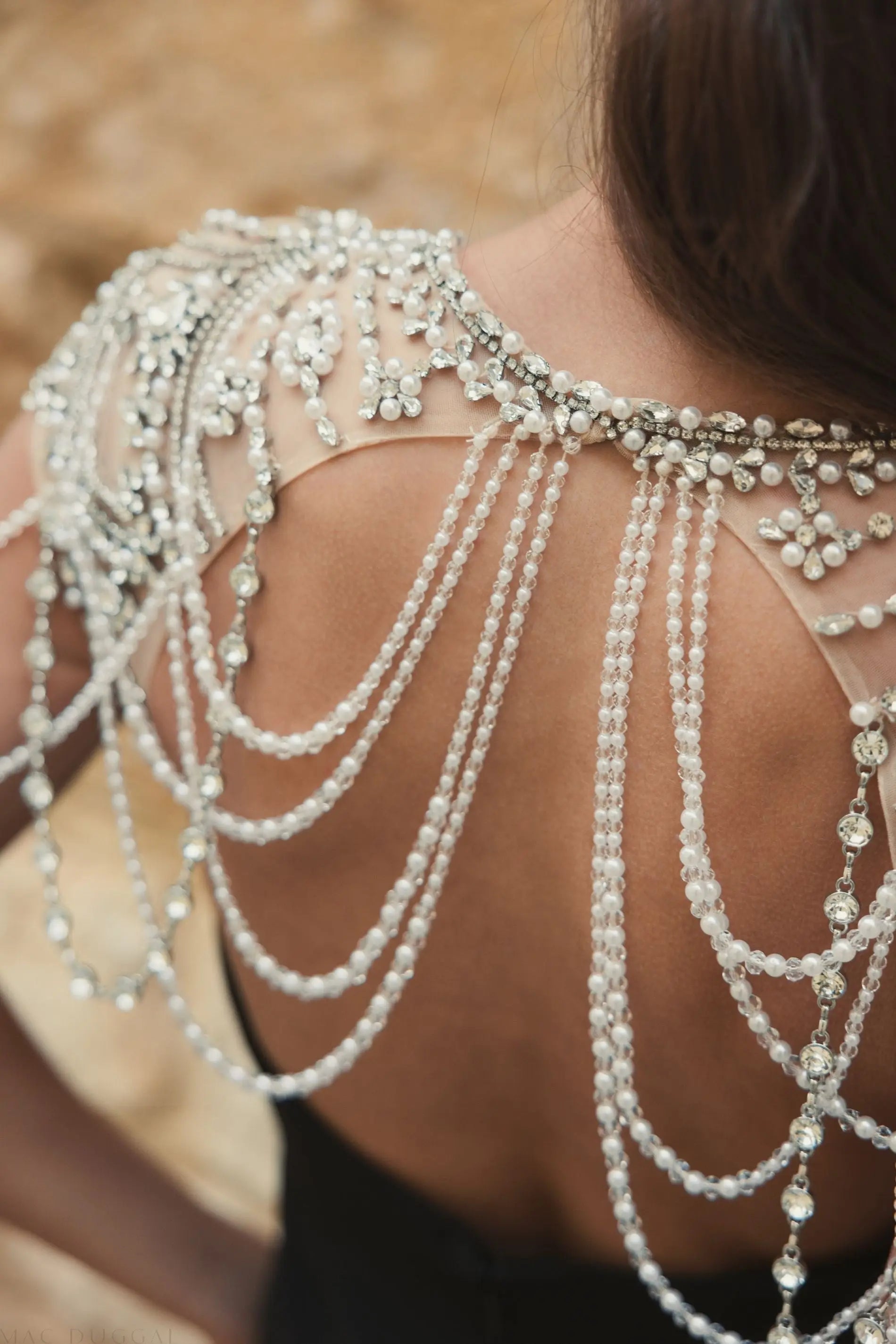 This elegant gown features draped pearls and rhinestone detailing and a dramatic mermaid silhouette, perfect for any black tie wedding or formal event.