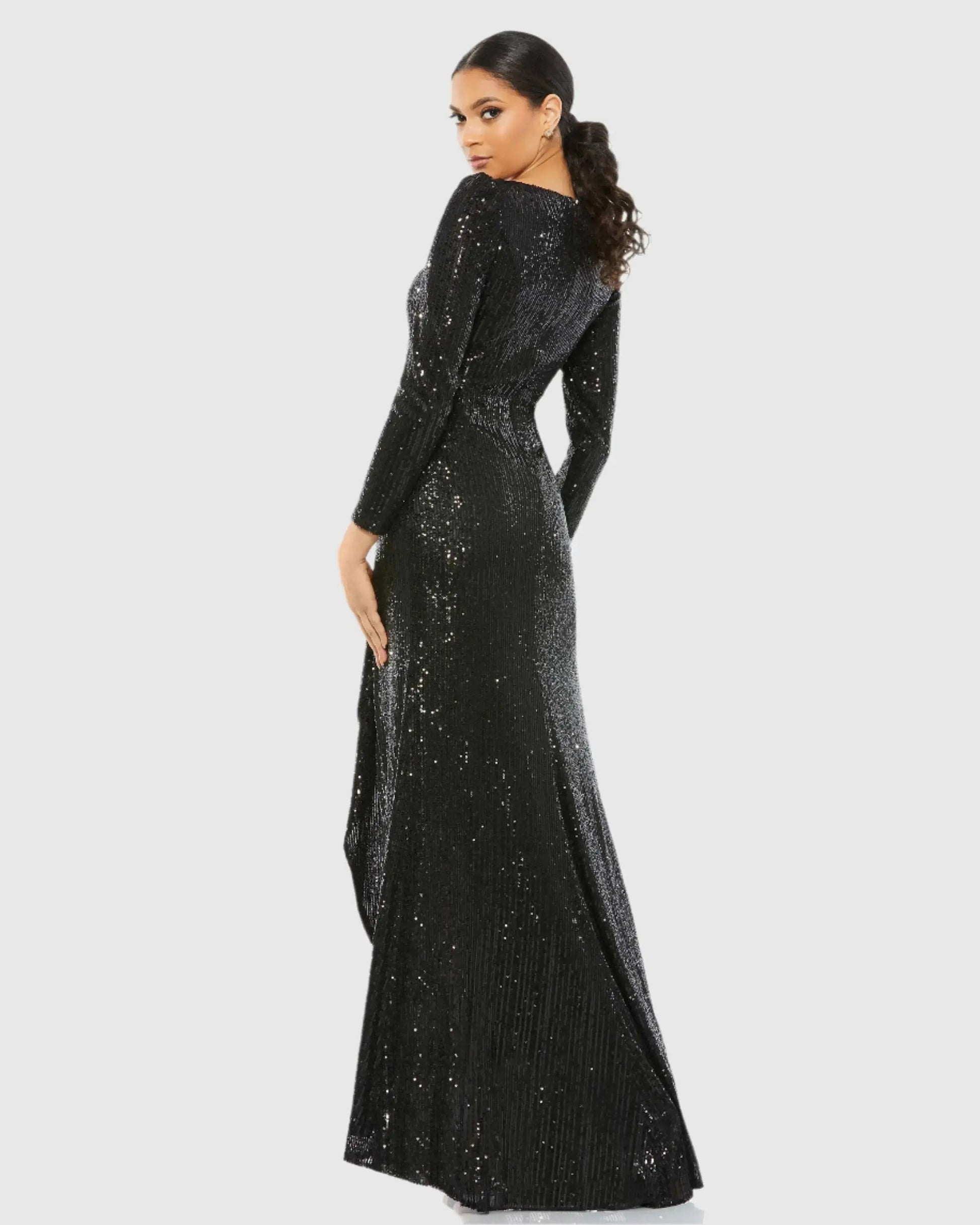 Long-sleeved sequin faux wrap gown with a flirty ruffle side slit and soft, sweeping train.