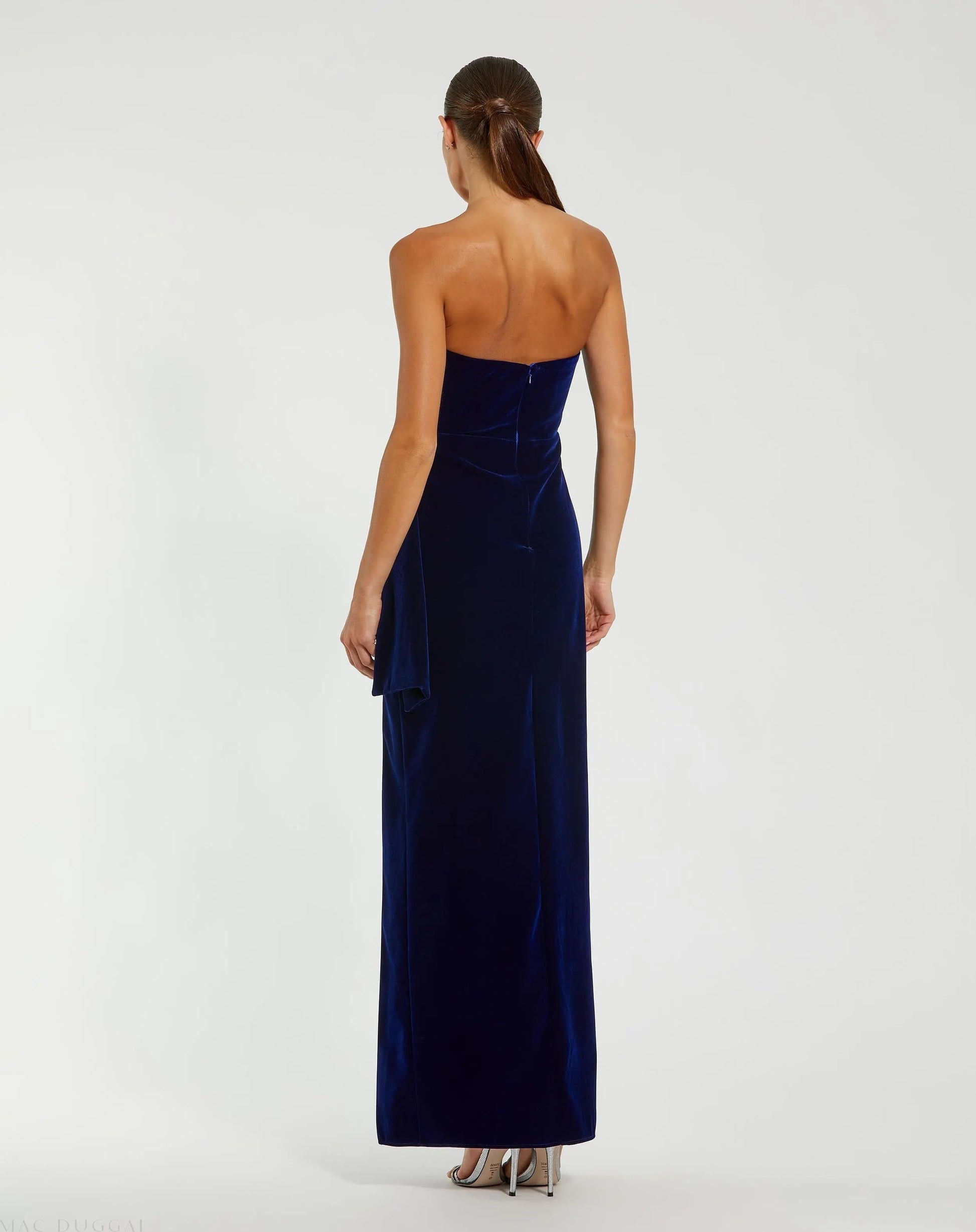 Crafted from soft velvet fabric, this stunning gown features a strapless neckline, daring thigh-high slit, and delicate ruched detailing. Perfect for any special occasion, this gown is sure to make a statement.