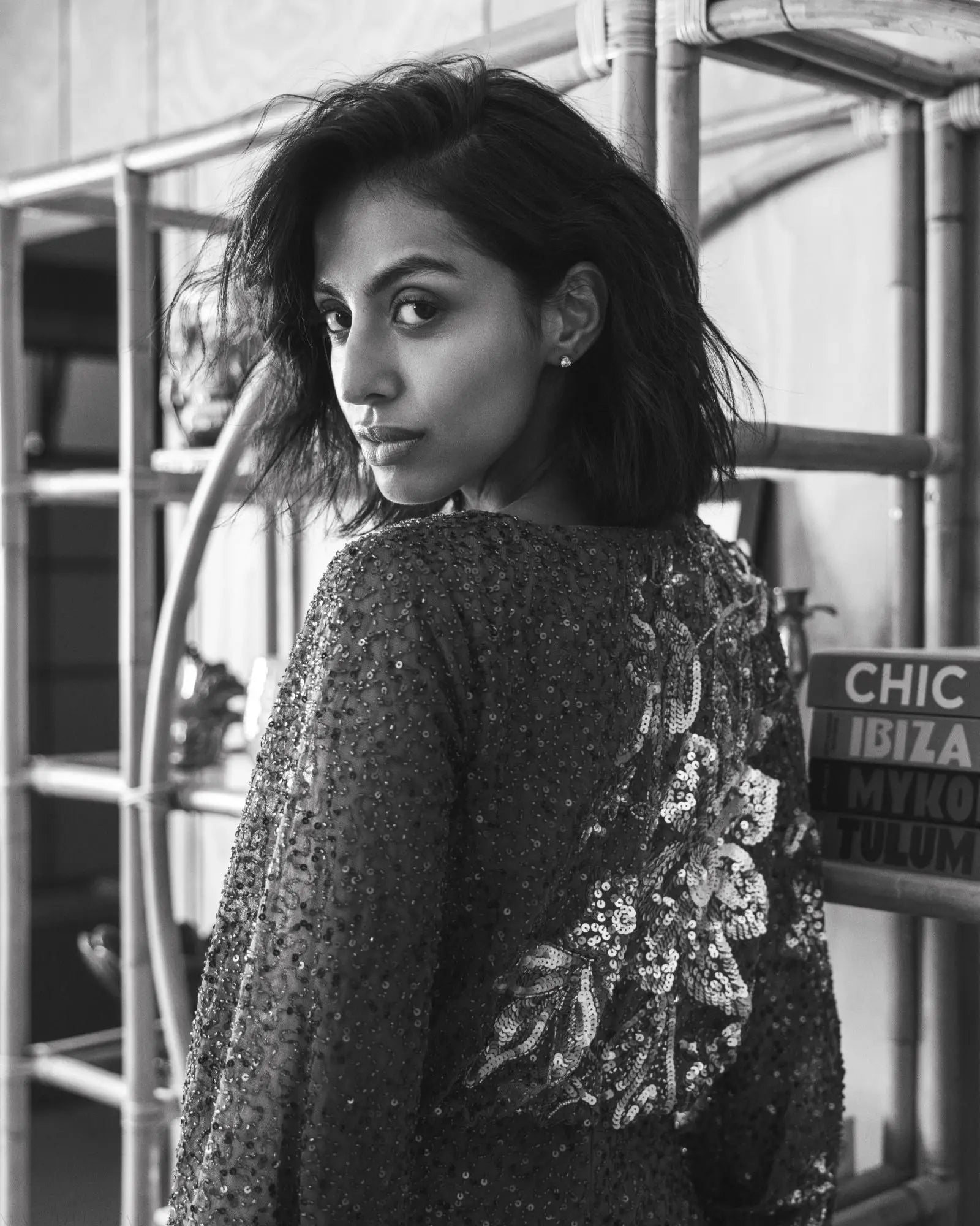 A timeless design, this gown dazzles with intricate floral sequin embellishments and delicate beading. Featuring a back vent slit and semi-sheer long blouson sleeves, it's the perfect choice for elegant evening and formal events.