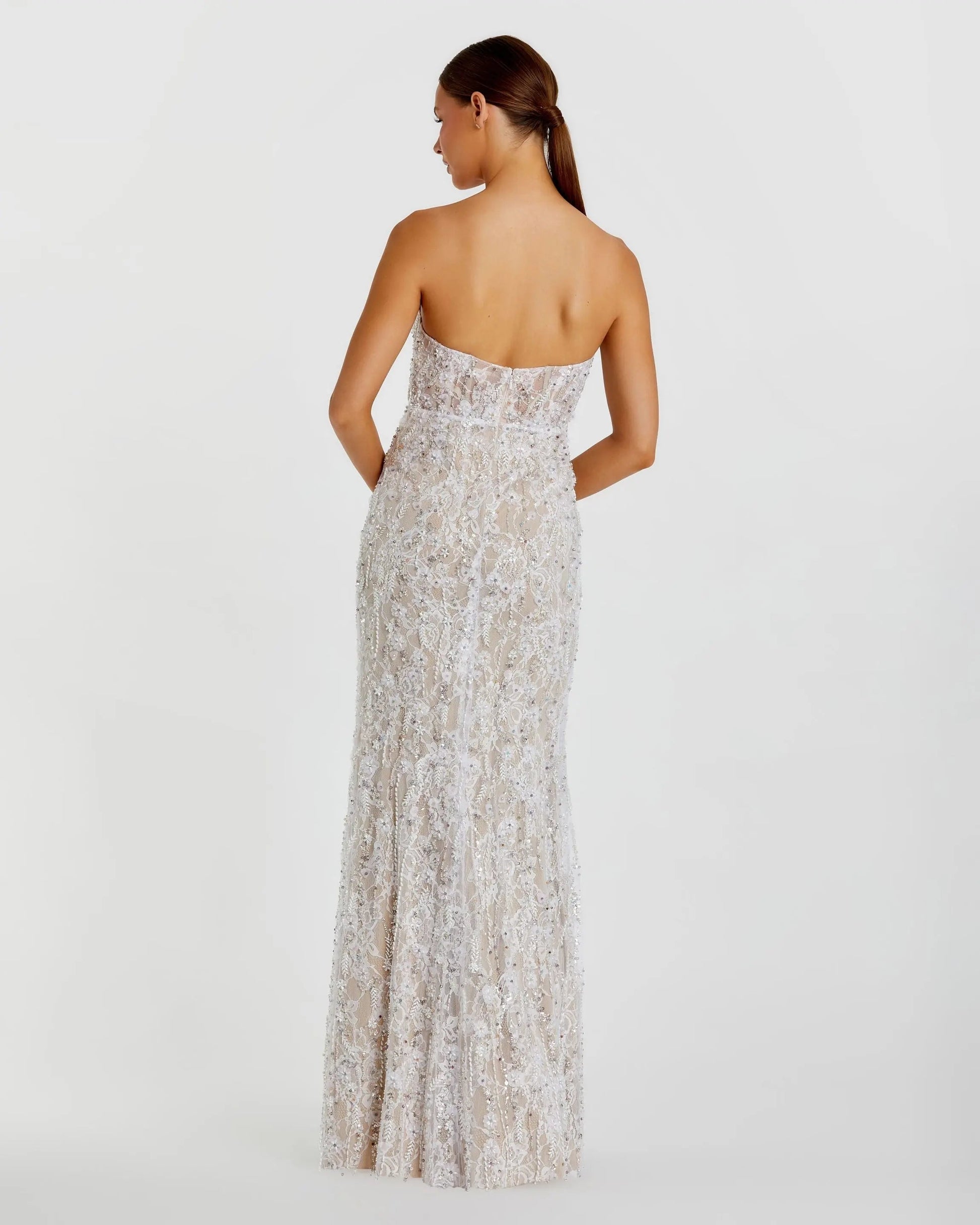 Crafted from delicate lace fabric and adorned with shimmering hand-place beadwork, this gown is made for unforgettable entrances. The strapless bustier bodice and soft trumpet silhouette create a look that feels both timeless and glamourous.