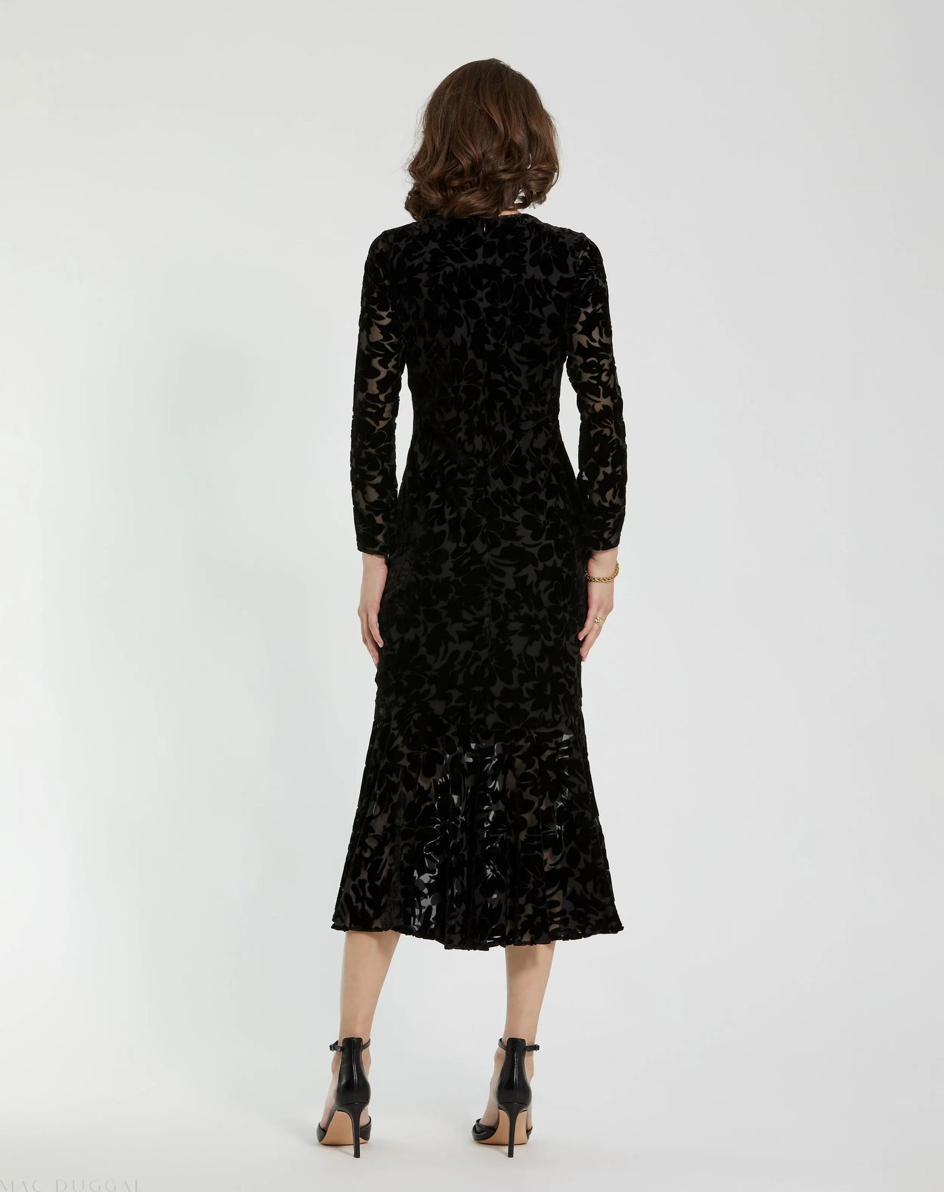 Turn heads in this little black midi dress, crafted from luxurious burnout velvet. With long sleeves and a graceful silhouette, it’s elegant yet versatile; perfect for fall cocktail parties, dinners, and evening gatherings.